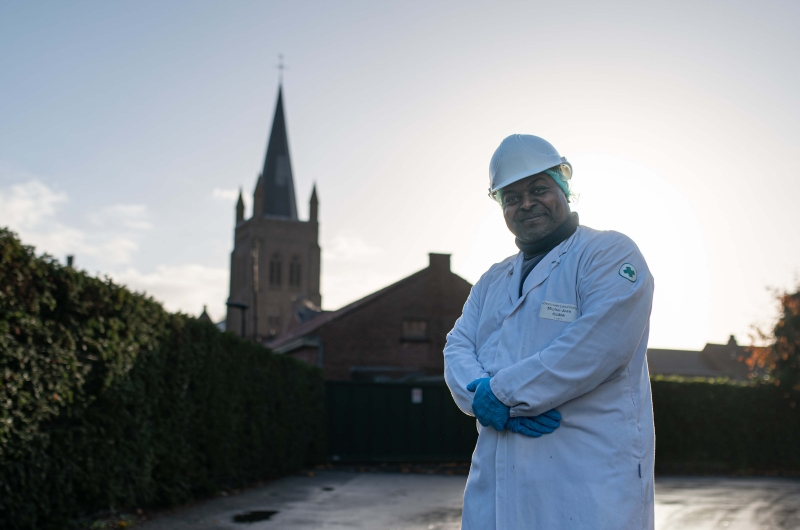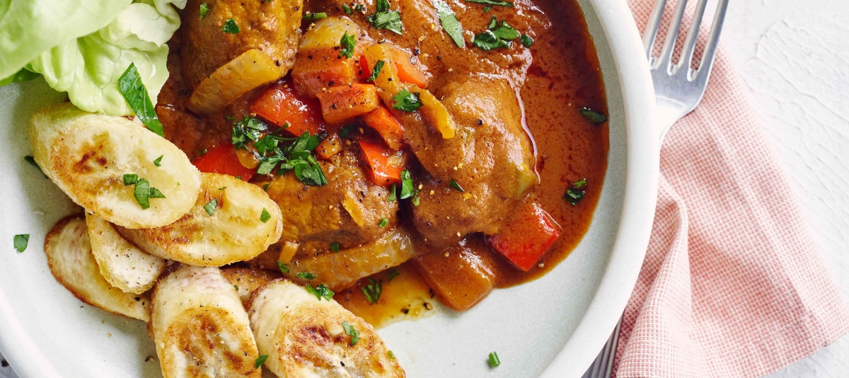 Meng in een kom de gember, knoflook, rode chilivlokken, sojasaus, bouillon en pindakaas door elkaar. Verhit wat olie in een grote stoofpot en fruit eerst de ui en paprika aan. Voeg het vlees toe en bak aan alle kanten goudbruin. Voeg de marinade van kruiden, bouillon en soja toe. Laat sudderen onder deksel gedurende 15 minuten. Voeg de tomatenpuree toe en laat nog eens 15 minuten garen. Bak ondertussen de bananen in wat olie. Serveer de stoofpot met de bakbananen en een blaadje sla.
