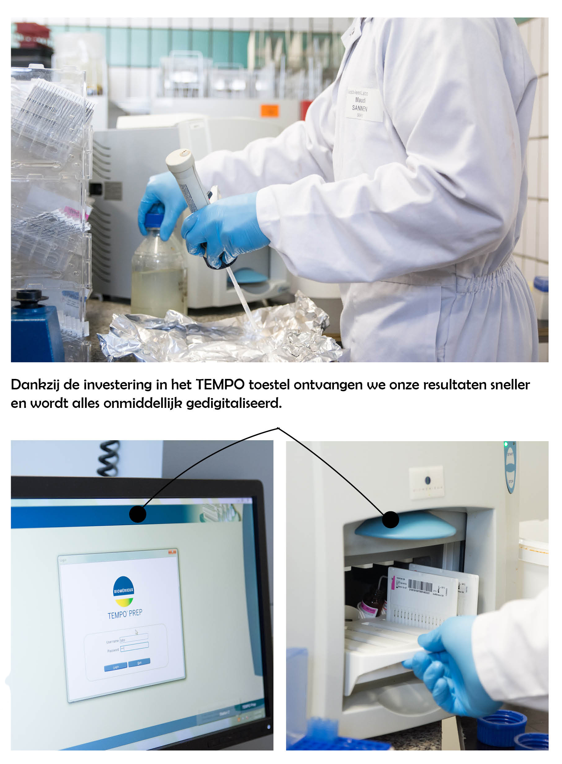 Als eerste luik kunnen we het hebben over onze analyses op microbiologie. Jaarlijks doen we ongeveer 10.000 dergelijke analyses. Dat is een verdubbeling bij vijf jaar geleden. Deze analyses gebeuren op vers vlees, diepgevroren vlees, R&D stalen en op eindehoudbaarheid. Dankzij de continue investeringen in de nieuwste technologiën (o.m. het TEMPO toestel) ontvangen we de resultaten voor de kiemgetallen reeds na 1 dag. Voordien duurde dit 3 dagen. Bovendien wordt alles onmiddellijk gedigitaliseerd. De resultaten voor melkzuurbacteriën worden na 2 dagen verkregen en die voor gisten en schimmels na 3 dagen.