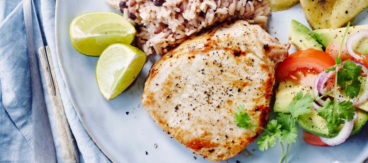 5. Serveer de rijst met zwarte bonen met de varkensoester, de tomaten-avocadosalade en de gebakken banaan, werk af met een plukje koriander.